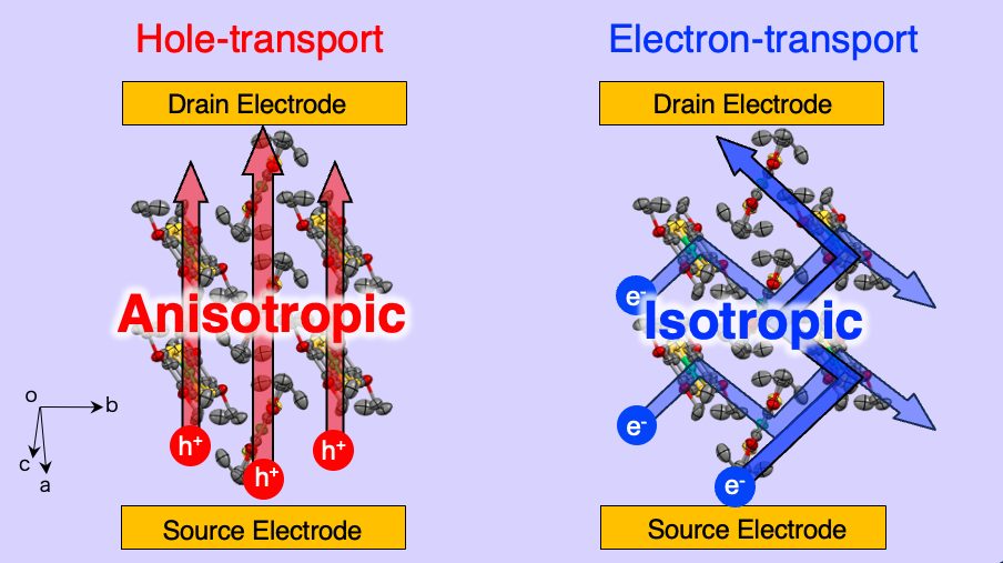 私たちは、有機化学の分⼦設計⼒を基に、分⼦集合によって⽣まれる固体の秩序構造と、そこから現れる特異な電⼦物性や量⼦ゆらぎを、固体物性化学の視点で探求しています。基礎原理を解明し、構造・プロセス・機能が連動する新しい電⼦材料の設計指針を提案します。